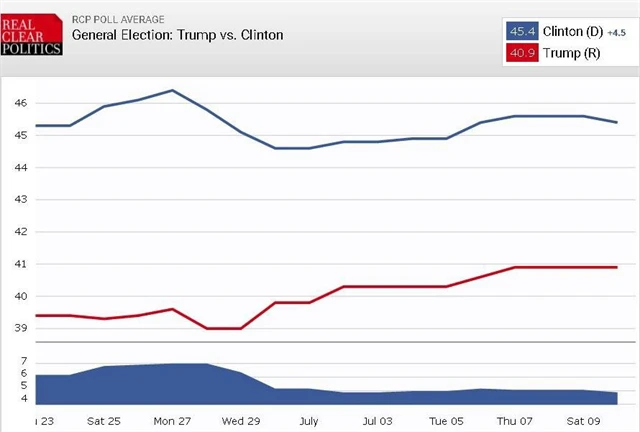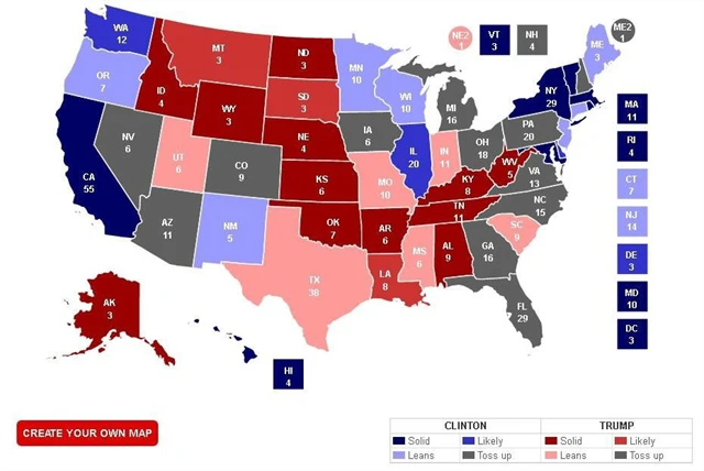 Touto optikou je náskok Clintonové ještě výraznější - má prakticky jistých 210 hlasů volitelů, Trump 164, dalších 164 hlasů tvoří nerozhodnuté státy, o které se povede nejtvrdší boj. K celkovému vítězství je potřeba 270 hlasů, z čehož plyne, že Clintonové jich chybí šedesát, kdežto Trumpovi 106. Musel by tedy v "bitevních" státech s řečenými 164 hlasy získat téměř dvě třetiny hlasů, aby uspěl. To zní jako opravdu náročný úkol.