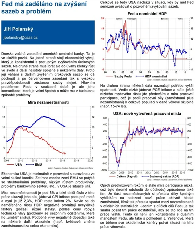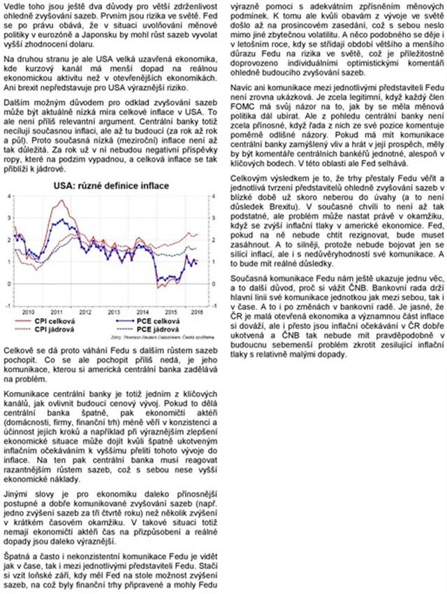 Americká centrální banka je ve složité pozici. Na jedné straně stojí ekonomický vývoj, který je konzistentní s postupným zvyšováním úrokových sazeb. Na druhé straně musejí Janet Yellenová a spol. brát v úvahu křehký růst ve světě a další nejistoty. Proto současné váhání banky s dalším zvyšováním úroků v USA. Trhy přestaly Fedu věřit a jednotlivá tvrzení představitelů ohledně zvyšování sazeb v blízké době již téměř neberou vážně. Problém může nastat v okamžiku, kdy se zvýší inflační tlaky v americké ekonomice. Fed pak nejspíše bude muset zasáhnout. A pak nebude bojovat jen se sílící inflací, ale i s nedůvěryhodností své komunikace.