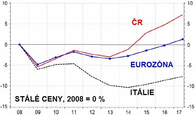 Zátěžovým scénářem EBA rozumí kumulovaný pokles české ekonomiky o 4,5 %, v případě eurozóny jako celku je to ale jen 2,3 % a třeba v Itálii zanedbatelných 1,5 %. Pro srovnání, když naposledy nastal opravdu stresový vývoj (takzvaná Velká recese a pokles ekonomiky v letech 2008-2009), česká ekonomika poklesla o 4,8 %, HDP eurozóny o 5,4 % a italská ekonomika o 6 %. Eurozóna se přitom má dostat na úroveň z roku 2008 v letošním roce, Česku se to povedlo již předloni a Itálie je stále 8 % "pod hladinou".