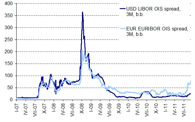 Mezibankovní trhy dnes vykazují vyšší míru napětí. Sice menší než po pádu Lehman Brothers, a týká se to spíše Evropy, jsou to však hodnoty, které jsme zaznamenali po (skoro)krachu Bear Stearns v březnu 2008. Jde o situaci, kdy bude případná nová "lehmanovská" událost poslední kapkou, která způsobí, že trhy zamrznou.