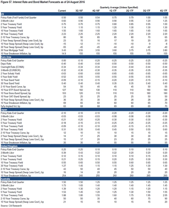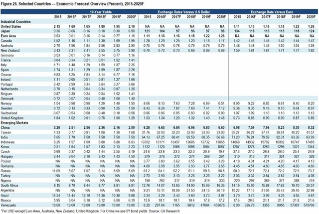 Na druhé straně najdete grafický přehled predikcí týkajících se ekonomiky, sazeb, dluhopisů, komodit a měn.