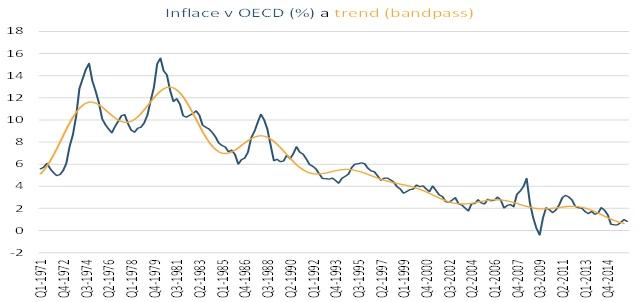 Zmíněné faktory společně s konvergencí měnově-politických režimů k režimu inflačního cílování během posledních 30 let v zemích OECD neustále stlačovaly inflaci (a inflační očekávání), a to k radosti a sebeuspokojení centrálních bank. Ačkoli tento trend nebyl lineární – zlomů je identifikovatelných několik, od počátku 80. let (Volckerova dezinflace) přes konec 80. let (počínající globalizace) a polovinu 90. let (přijetí režimů cílování inflace) až po období po krizi z let 2008-2009 –, směr byl jednoznačně dolů. Nyní, když ten samý trend dostal inflaci pod arbitrárně stanovený cíl, se však potkává s krajní nelibostí centrálních bank.