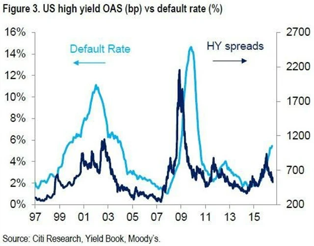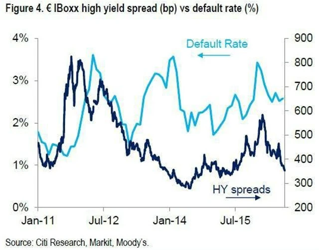 Je pravda, že polovinu bankrotů představují firmy v energetickém sektoru, a jelikož spready předbíhají defaulty, jejich počet možná klesne. Přesto působí situace poněkud zvláštně. Ani v Evropě není, i přes minimální spready, počet bankrotů minimální.