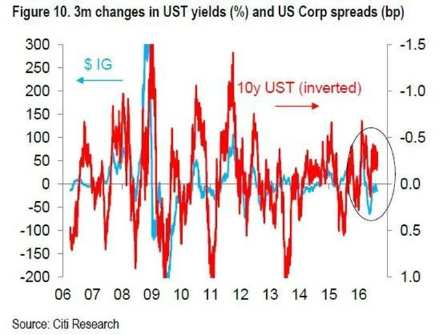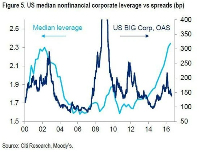 Nejsou to však jen spready dluhopisů s vysokým výnosem, kde je situace netypická. Spready u firemních dluhopisů běžně odrážejí zadlužení firem, ale tato korelace od roku 2011 také neplatí.