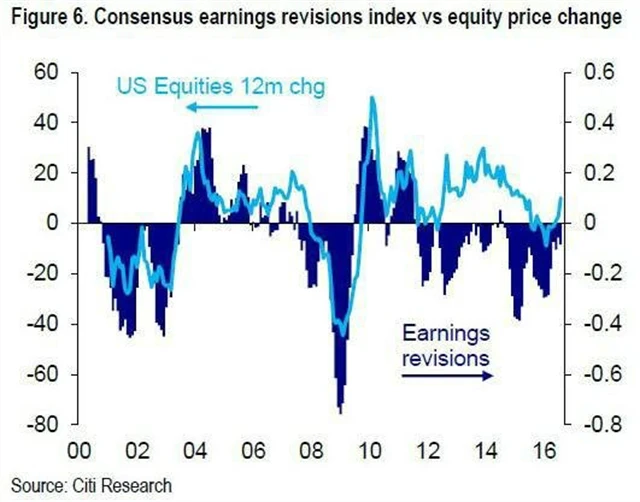 A ještě jedna porušená korelace, tentokrát na akciovém trhu, kde se citlivost na fundamenty také začala kazit kolem roku 2011. Předtím při zhoršujících se odhadech zisků docházelo k výprodejům, od roku 2012 se ale prakticky nic neděje.