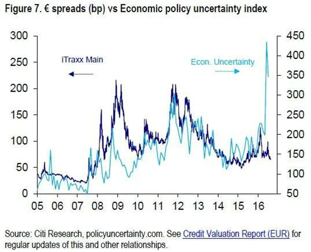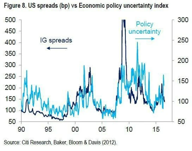 Indexy nejistoty v ekonomice od společnosti Baker, Bloom & Davis, které mimo jiné sledují i to, kolikrát se slovo nejistota objeví v médiích, po léta zaznamenávaly doslova zázračnou korelaci se spready. Ani to dnes neplatí.