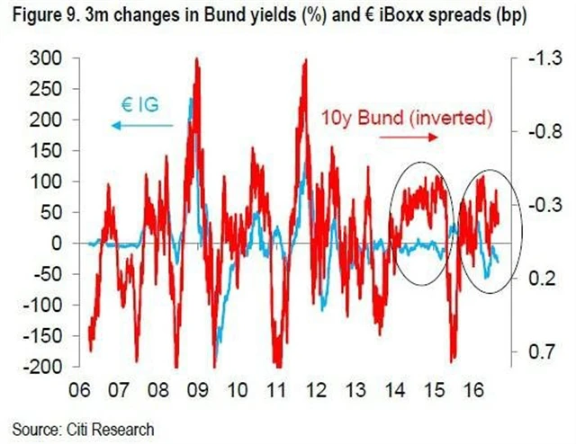 Jedním ze základních pravidel při investování do dluhu je negativní korelace mezi vývojem ekonomiky a spready na jedné straně a sazbami na straně druhé. Když se ekonomice daří, spready rostou a sazby klesají. Funguje to také opačně. A i když to není vždy přesné, funguje to. Dnes je to ale naopak - když klesají sazby, klesají i spready.