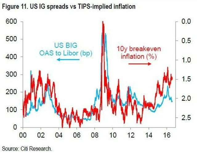 Stejné je to s inflací. Když se dříve očekával propad inflace, klesaly také výnosové spready. Letos tomu tak není.