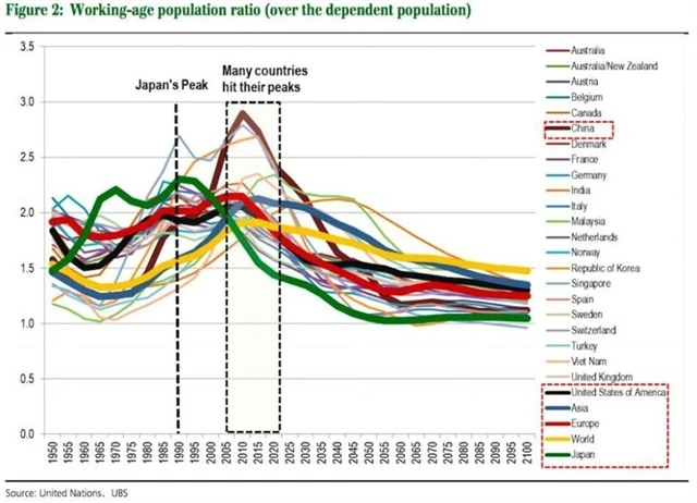 Banka UBS přišla s grafem, který pesimistickou teorii o stárnoucím obyvatelstvu může potvrzovat, protože mnohé z ekonomicky vyspělých zemí se začínají potýkat s podobně špatným demografickým vývojem. Většina ekonomik má proto dost možná našlápnuto japonským směrem.