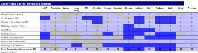 Akcie bank po celém světě zažívají volný pád, každým dnem rostou obavy především o evropský bankovní sektor, který může čelit bankrotu některé ze zemí eurozóny. Analytici Deutsche Bank udělali zajímavý výtah z makroekonomických grafů a tabulek do jedné přehledné "mapy nebezpečí", která ukazuje země s nejvíce (nebo nejméně) ohroženým bankovním systémem, a to jak ve vyspělých, tak rozvíjejících se zemích.