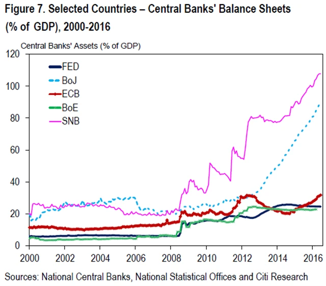 Nákupy aktiv centrálními bankami asi v nadcházejících letech zůstanou velké, možná navíc zasáhnou další třídy aktiv (jako bankovní půjčky nebo akcie). V nejbližší době očekáváme další uvolnění měnové politiky japonské centrální banky v podobě snížení depozitní sazby (pravděpodobně v lednu), a zatímco ECB asi v prosinci prodlouží program nákupu dluhopisů, Fed by mohl v prosinci přistoupit k letošnímu prvnímu (a poslednímu) zvýšení sazeb.