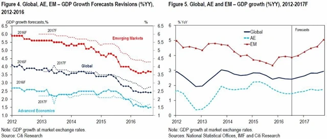 Nadále očekáváme pomalý, ale poměrně ustálený růst světové ekonomiky v roce 2016 o 2,4 % a v roce 2017 o 2,7 %. V rámci toho čekáme relativně stabilní růst vyspělých ekonomik (1,5 % v roce 2016 a 1,7 % v roce 2017) a mírné zrychlení růstu mladých ekonomik (3,7 % v roce 2016 a 4,3 % v roce 2017), neboť recese v některých klíčových rozvíjejících se ekonomikách slábnou.
