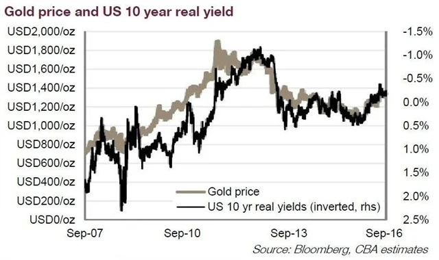 Vivek Dhar, komoditní analytik z Commonwealth Bank, nedávno přišel s grafem, který ukazuje, že cena žlutého kovu a reálný výnos 10letých amerických vládních dluhopisů (nominální výnos očištěný o inflaci) jsou v silném inverzním vztahu.
