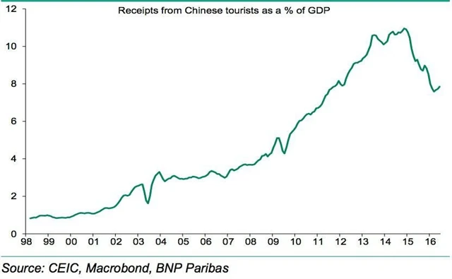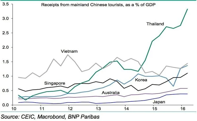 Podle analytiků z BNP Paribas se čínští turisté činí v celém regionu, nejen v Japonsku, a jde o "jeden z nejzajímavějších příběhů strukturálního růstu ve světě". Nejvíce z toho po Hongkongu těží Thajsko, kam se jen v roce 2015 vydalo 8 milionů čínských turistů a zajistilo zemi zhruba 3,5 % HDP. Poté, co do Thajska přestali ve velké míře jezdit Rusové, je to pro zemi dobrá zpráva.