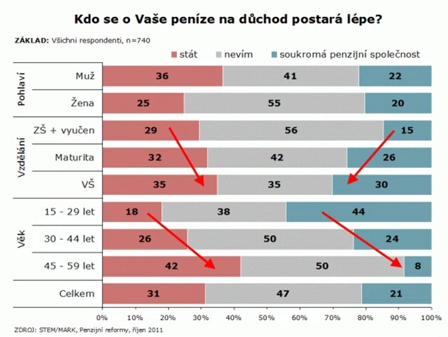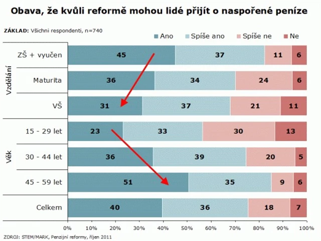 Češi penzijní reformě nerozumí. A tak se bojí. Strach mají zejména ze ztráty naspořených peněz. Kdo do penzijní reformy půjde, a kdo se jí raději vyhne? A kdo se bojí nejvíc? Na tyto a další otázky odpovídá průzkum společnosti STEM/MARK pro společnost Fincentrum a deník MF Dnes.