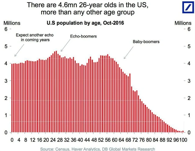 Mladí lidé v USA se bojí investovat a nechtějí bydlet ve svém. Z prvního grafu vyplývá, že generace "baby boomers" (narozeni mezi lety 1946 a 1964) se činila a její potomci, označovaní jako "generace Y" (nebo také mileniáni, případně "echo boomers" jako v grafu), tvoří velké procento současné americké populace (26letých je nyní v USA nejvíce).