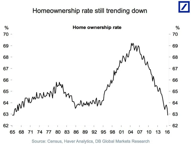 Je to pro ně levnější a pohodlnější, takže se do stěhování do vlastního nehrnou. Z posledního grafu ale plyne, že Američané obecně, tedy nejen mladí, se po finanční krizi zrovna nepřetrhnou, aby nakupovali domy. Míra vlastnictví nemovitostí již několik let výrazně klesá.