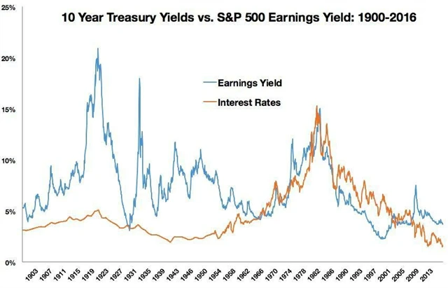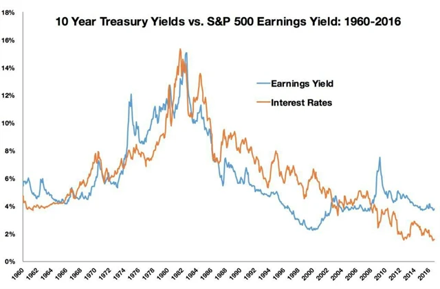 V poslední době se staly úrokové sazby často zmiňovaným ukazatelem budoucího vývoje. Podívejme se na vztah úrokových sazeb (prostřednictvím výnosů 10letých státních dluhopisů USA) a ziskového výnosu akciového trhu (prostřednictvím takzvaného earnings yield, který se počítá jako obrácená hodnota tržního ukazatele P/E; ukazuje, jaký výnos by investor obdržel, pokud by byl celý zisk firmy vyplacen jako dividenda).