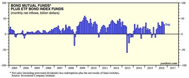 Základem tržního dění jsou dluhopisy a jejich obliba mezi investory od dob finanční krize. Od roku 2009 totiž do amerických dluhopisových fondů nateklo více prostředků než do těch akciových (1,55 bilionu dolarů oproti 1,34 bilionu dolarů), a to přesto, že jsme svědky jednoho z největších býčích akciových trendů v historii. Jak je z grafu níže patrné, jediným rokem, kdy dluhopisové fondy zaznamenaly odliv prostředků po krizi, byl 2013, kdy se poprvé začalo spekulovat o ukončení kvantitativního uvolňování a zvyšování sazeb ze strany Fedu.