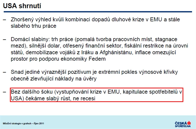 Ačkoli se v Evropě rýsuje dohoda o navýšení EFSF, čtvrtý kvartál bude nahrávat dolaru. Ekonomika USA poroste sice pomalu, návrat recese ovšem nepředpokládáme. Tak lze shrnout měsíční strategii z pera analytiků České spořitelny.