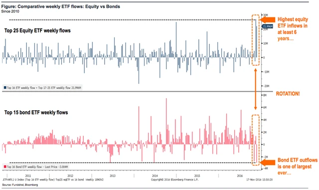 Akciová rally z posledních dvou týdnů v kombinaci s výprodejem dluhopisů dává vzpomenout na "velké" trendy minulosti. Od zvolení Donalda Trumpa příštím americkým prezidentem investoři lijí peníze do akciových fondů a opouštějí ty dluhopisové téměř bezprecedentním tempem.