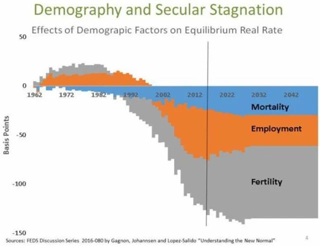 Ekonomy může zajímat i mechanismus, kterým demografie zasáhla do reálných sazeb. Tak například stárnutí obyvatel bude snižovat pracovní sílu. Silné ročníky prostě začínají odcházet do důchodu a bude klesat počet pracovníků (pokud nebudou nahrazeni imigrací). Bude se tak zvyšovat poměr mezi množstvím kapitálu a prací v ekonomice, což indikuje nadbytek kapitálu, který ve finále povede ke snížení jeho výnosnosti, atraktivity investičních projektů, a tedy i reálných sazeb. Mimo jiné i proto podniky méně investují, což je podpořeno ještě poklesem cen technologií.