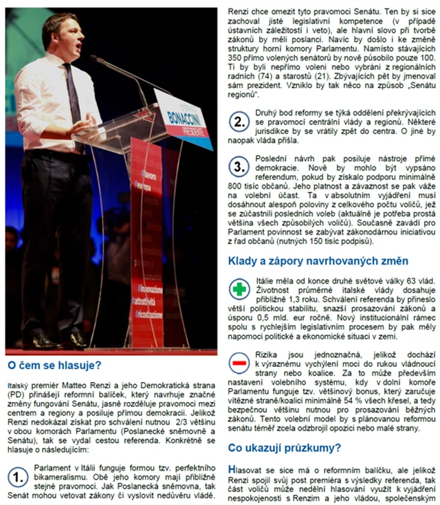 V neděli 4. prosince se v Itálii koná referendum o návrzích premiéra Mattea Renziho. Zdálo by se, že ve srovnání s britským referendem nebo americkými prezidentskými volbami se jedná o druhořadou záležitost. I tak ale přitahuje pozornost. O čem přesně Italové hlasují a jaké může mít výsledek plebiscitu dopady na Itálii a celou Evropu?