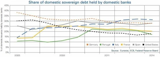 Řada italských bank drží poměrně velká portfolia vládních dluhopisů. Nejde o nikterak neobvyklou záležitost, protože banky svou přebytečnou likviditu užívají na nákup dluhopisů, z nichž realizují výnos. Těm mohou nadále přisuzovat nulové rizikové váhy, takže si nemusejí dělat starosti s doplněním kapitálu. Výhodou je i fakt, že nulové rizikové váhy státních dluhopisů umožňují držet větší objem prostředků u jednoho subjektu (v tomto případě vlády), než obecně dovolují evropské regulatorní standardy. Výsledkem je, že bankovní sektor zpravidla drží 20–30 % veškerých domácích státních dluhopisů. V případě italských bank jde o úroveň spíše na horní hranici tohoto pásma či lehce nad ní.
