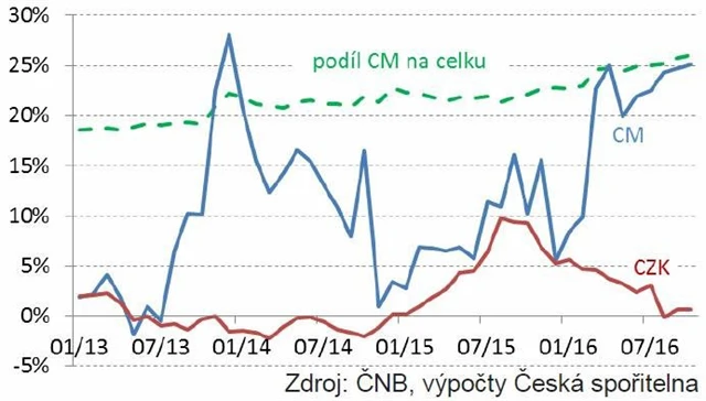O jaký trend jde? Zatímco úvěry v korunách v posledních měsících prakticky přestaly růst (co si některé firmy půjčí, to jiné ve stejnou dobu splatí), cizoměnových úvěrů již od února přibývá dvojcifernými tempy. A stále rychleji.