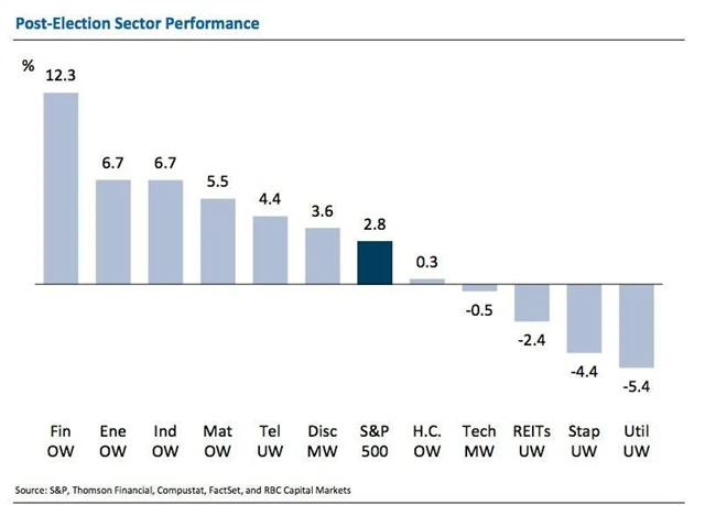 Graf ukazuje výkonnost jednotlivých sektorů po amerických volbách společně s tím, zda jsou nadhodnocené (OW), podhodnocené (UW), nebo přibližně dobře ohodnocené (MW). Například technologické firmy mají podle všeho dostatek volné hotovosti, takže je pravděpodobné, že potenciál jejich růstu hned tak nebude vyčerpán. Podle Goluba za to možná může globalizace, která je pro tyto firmy daleko podstatnější než pro firmy ze sektorů jako energetika nebo finance, které jsou spíše orientované na americký trh.