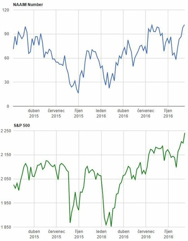 Index americké Národní asociace aktivních investičních manažerů (NAAIM) ukazuje, že expozice aktivních manažerů na americkém akciovém trhu je po rychlém nárůstu poblíž ročních maxim. Cílem těchto manažerů je zvažovat poměr rizika a výnosu a udržovat portfolia klientů "v souladu" s děním na trhu. Aktuálně je tedy posun indexu logický, akciím vane do plachet příznivý vítr, respektive zvolený americký prezident slibuje, že se ufouká, aby tomu tak bylo. Láska k akciím kvete.