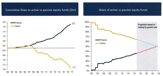 "Tvrzení, že aktivně řízený fond v příštím roce překoná své pasivní konkurenty, je nyní asi nejvíce kontrariánským postojem. A je pravda, že pokud se podíváte na množství peněz, které tečou do jedné a druhé skupiny fondů, tak to v jejich prospěch rozhodně nehovoří," míní Hartnett. Pasivně spravované fondy v posledních letech v oblibě jasně válcují svou aktivně spravovanou konkurenci.