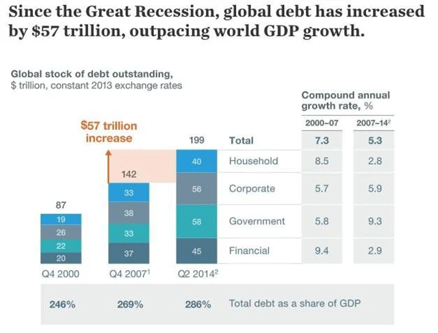 Odpovědí na globální dluhovou krizi byl dramatický nárůst dluhu prakticky ve všech oblastech a sektorech. Často citovaná studie konzultantů z McKinsey vyčíslila toto vytloukání klínu klínem mezi roky 2007 a 2014 na 57 bilionů USD. Vábení levné likvidity podlehly i před krizí dluhem nepříliš ohrožené nervové uzly světového systému jako Čína, jejíž dluh se zečtyřnásobil. Přičteme-li k tomu fakt, že hlouběji do červených zapadla většina významných rozvinutých a rozvíjejících se zemí a že zadlužení domácností v části Evropy a Asie vystoupalo na nová maxima, představuje současný dluh hrozbu pro finanční stabilitu a hospodářský růst světa, varuje McKinsey.