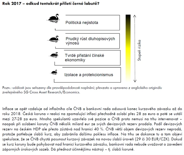 Černých labutí, které v hantýrce finančních trhů představují nepředvídatelné události s významným dopadem na trh, může v roce 2017 přiletět více. Na druhou stranu, pohyby na trhu vytvářejí investiční příležitosti, kterých bude i letos dost. A protože jedno staré dobré přísloví říká, že "štěstí přeje připraveným", podívejme se na tři realistické scénáře vývoje české ekonomiky pro rok 2017.