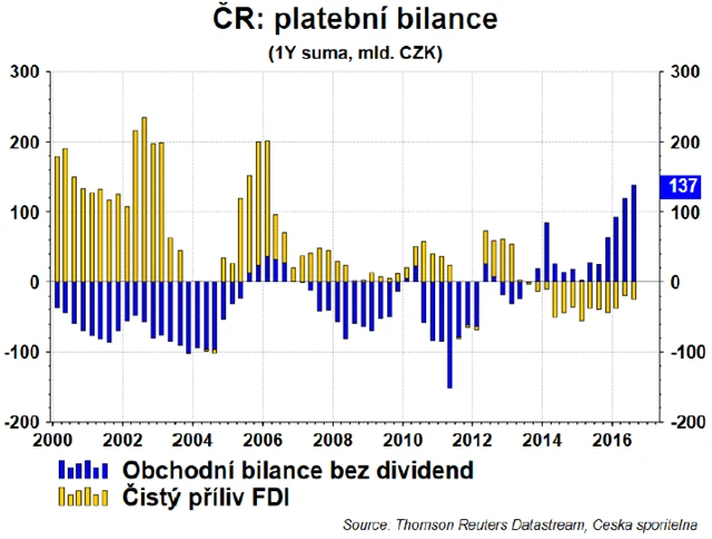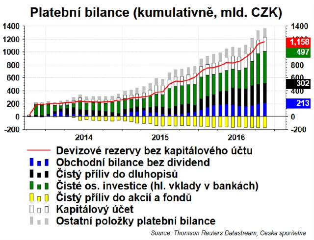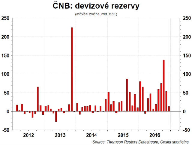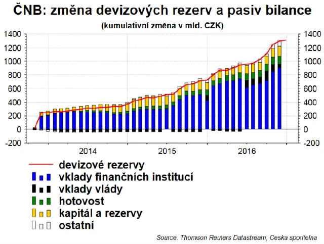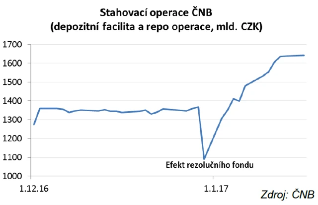 Začátek roku 2017 byl pro ČNB mimořádný. Data o stahovacích operacích banky ukazují, že došlo ke zvýšení úložek bank u centrální banky od začátku roku o 270 miliard Kč. Tato částka indikuje, že ČNB zvýšila devizové rezervy o zhruba 270 miliard Kč za první dva týdny (bez efektu rezolučního fondu). To představuje 1 miliardu eur za pracovní den. **Pokud by objem intervencí nepolevil, ČNB by do konce prvního čtvrtletí zdvojnásobila devizové rezervy (zvýšení ze zhruba 40 % HDP na konci roku 2016 na 90 % HDP).
