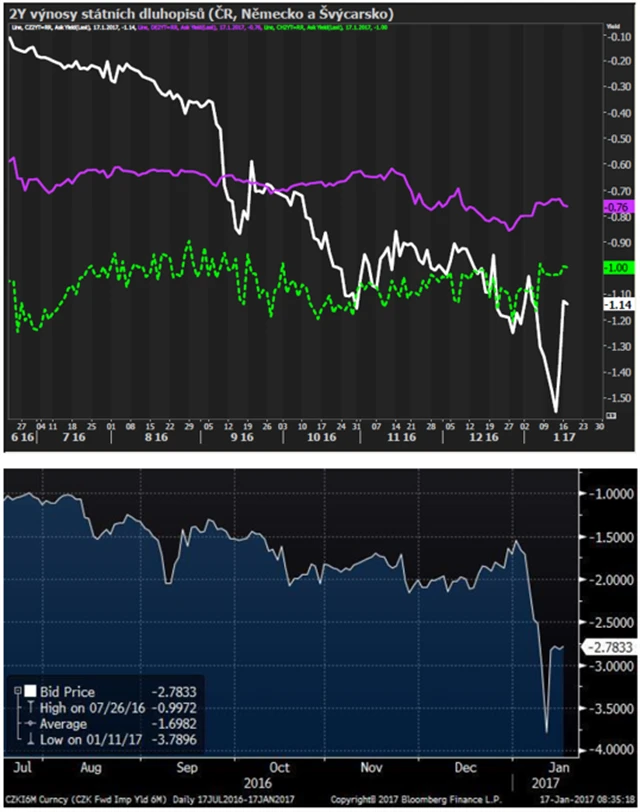 Důležitou roli v čištění trhu sehrávají tržní sazby. Výnos ročních českých státních dluhopisů poklesl na -1,7%, ty dvouleté se obchodovaly na -1,6 % (před korekcí na konci minulého týdne). Krátkodobé české státní dluhopisy jsou tedy nejdražší na světě. Podobně implikovaný šestiměsíční swap poklesl dokonce až na -3,8 % (před zmíněnou korekcí).