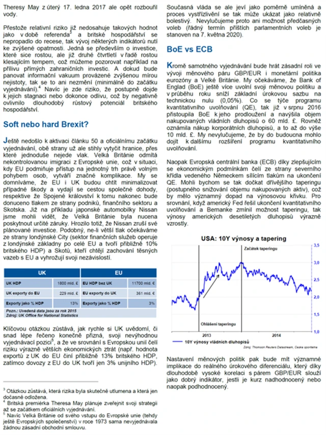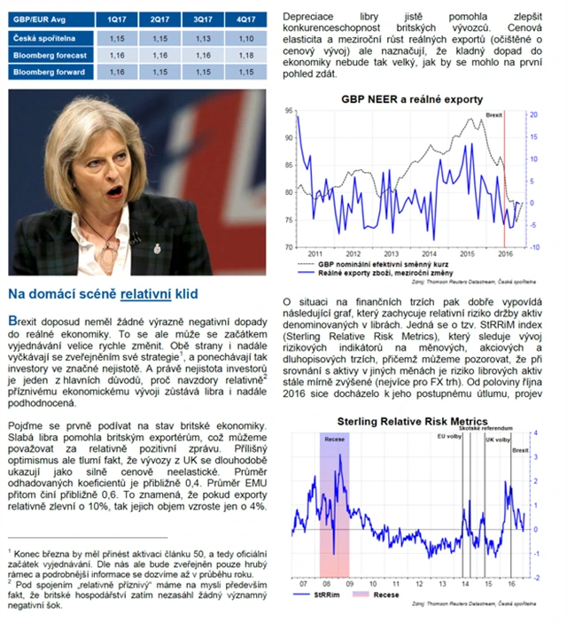Proti Británii hovoří i to, že kromě pozice slabší strany při jednáních a značných tlaků (například ze strany Skotska) bude muset vyjednávat s velice tvrdými hráči, kteří se netají tím, že jí to rozhodně neulehčí. Společně s nastavením měnových politik ve Spojeném království a v eurozóně a blížícími se nizozemskými parlamentními a francouzskými prezidentskými volbami, které podle našeho názoru do určité míry paralyzují průběh vyjednávání a prodlouží období nejistoty, to bude působit proti opětovnému posilování libry.