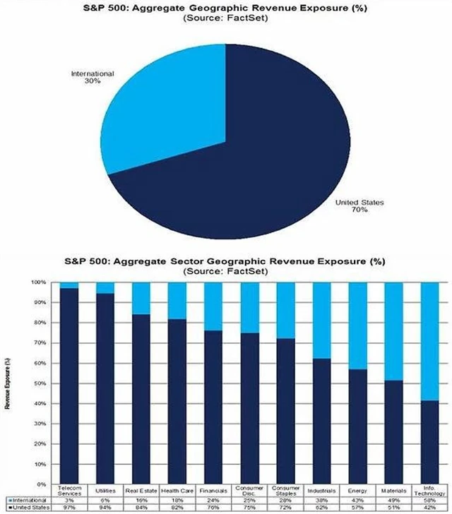 Analytici ze společnosti FactSet se podívali na tržby společností, jejichž akcie jsou zahrnuty v indexu S&P 500. Zjistili, že v rámci celého indexu proudí ze zahraničí do pokladen firem 30 % jejich tržeb. Do tabulky seřadili i jednotlivé sektory právě podle podílu tržeb ze zemí mimo USA.
