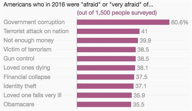 Američané se podle průzkumu nejvíce bojí korupce ve vládě, teroristického útoku a nedostatku peněz. Dále pak omezení práva nosit zbraň, smrti svých blízkých a tak dále. Absurdita je zjevná na první pohled. Má to říkat zhruba toto: "Vidíte, když jsou Američané takoví idioti, není divu, že zvolili do Bílého domu troglodyta."