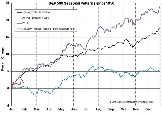 "K naplnění lednové trifekty nedochází příliš často. Naposledy se tak stalo v roce 2013," upozorňuje Ryan Detrick, stratég z LPL Financial. Od roku 1950 se tak ale stalo již pětadvacetkrát. Letos lednová trifekta splněna byla, výkonnost S&P 500 ale byla na začátku roku slabší, takže by index musel v dalších měsících zabrat, aby statistiky vyrovnal.