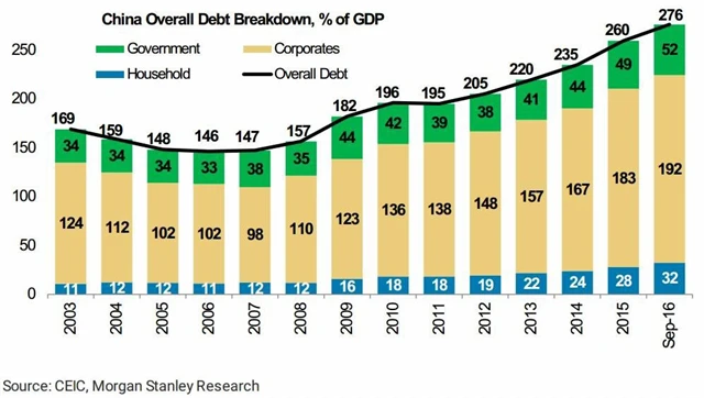 Dlouhodobý růst dluhu a rychlé zvyšování zadlužení v Číně není žádnou novinkou, vrásky na čele dělá ekonomům a investorům již několik let. Většinou jde o strach z nesplácení, který se týká zejména firem, a to jak soukromých, tak i těch ovládaných státem, které se v poslední době zadlužují enormním tempem.