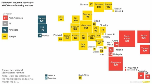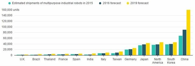 Potenciál automatizace vycítila i čínská společnost Midea Group, která loni koupila za 4,5 miliardy eur německého výrobce průmyslových robotů KUKA. Právě KUKA uvádí, že hodina provozu průmyslového robotu vyjde v průměru na přibližně pět dolarů a třicet centů, tedy pět eur. Hodinové náklady na práci v Německu se pohybují kolem 50 eur a v Číně kolem 10 eur.