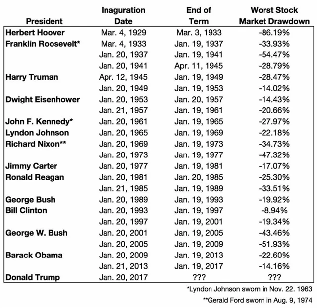 Jak dokazuje následující přehled, prakticky každý americký prezident od konce 20. let minulého století byl svědkem výplachu na akciových trzích. Bez ohledu na převahu, s jakou volby vyhrál, a bez ohledu na to, zda to byl demokrat, nebo republikán. Nejhlubší dílčí propad během čtyřletého funkčního období byl od konce 20. let v průměru asi 30 %, demokratičtí prezidenti byli svědky v průměru 24% propadu cen akcií, republikánští pak 37% sestupu.
