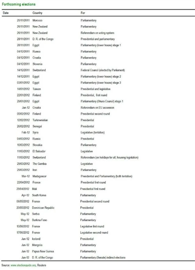 V níže uvedené tabulce mohou investoři najít země, v nichž by v blízké době měli bedlivě sledovat politický vývoj kvůli nadcházejícím volbám: