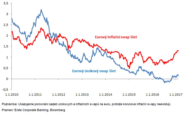 Inflace a úrokové sazby chodí v trendu spolu. Nízké inflaci v posledních letech vděčí za slabou korunu nejen exportéři, ale také všichni, kdo mají úvěry na plovoucí sazbě nebo na nízkém fixu. ČNB letos asi sazby zvyšovat nebude. Mění se ale sazby tam, kde se dají budoucí úrokové náklady zamknout. Sazby úrokových swapů (IRS) si sáhly na dno v létě 2016 po britském referendu a od té doby narostly o necelých 60 bazických bodů na 5letém IRS.