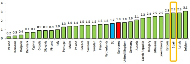 Obavy by se mohly týkat konkrétně Španělska. To v předchozí dekádě vykazovalo poměrně rychlý růst relativních cen (měřených reálným efektivním kurzem), čímž teoreticky měla klesat konkurenceschopnost země. Ve skutečnosti se ale Španělům v uvedeném období dařilo udržovat, ba dokonce zlepšovat pozici v rámci exportu z eurozóny jako celku.
