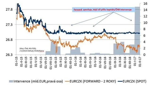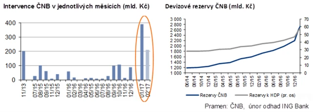 "V únoru podle našich odhadů intervence ČNB pokračovaly stále v relativně intenzivní podobě a dosáhly objemu zhruba 210 miliard korun. Ve srovnání s lednem jde sice jen o zhruba poloviční hodnotu, z pohledu trvání kurzového závazku se však jedná o druhý nejvyšší měsíční objem," říká Jakub Seidler. "Za první dva měsíce roku již ČNB intervenovala v objemu 600 miliard korun, což výrazně přesahuje hodnotu za celý rok 2016 (455 miliard korun). Ačkoli již někteří investoři začali své pozice uzavírat, výrazný příliv spekulativního kapitálu stále vyvolává nejistotu ohledně chybějící protistrany pro obchody s tímto spekulativním kapitálem po ukončení kurzového závazku," doplňuje Seidler.