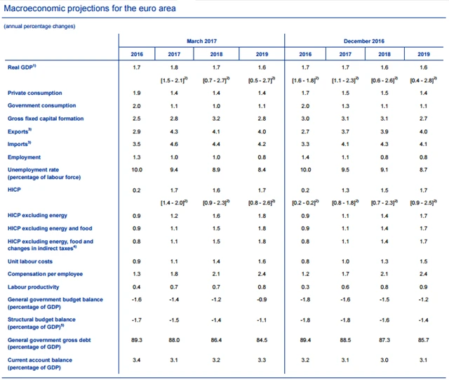 ECB - makroekonomický výhled (březen 2017 vs. prosinec 2016), zdroj: ECB