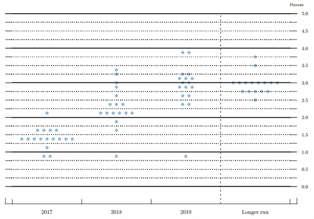 Výhled výše základní úrokové sazby Fed proti prosinci prakticky nezměnil. Letos se podle něj základní sazba zvýší na 1,4 %, příští rok stoupne na 2,1 % a v roce 2019 se posune na 3 % (prosincový odhad pro rok 2019 byl 2,9 %). Dlouhodobý výhled Fed ponechal na úrovni 3 %.