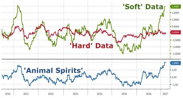 "Analýza dat ukazuje, že tzv. tvrdá data (HDP, průmyslová výroba apod.) se v posledních měsících spíše zhoršují. Lídrem optimismu jsou tak tzv. měkká data jako ukazatele důvěry. Samo o sobě to není špatnou informací, protože bez optimismu se ekonomika nenakopne, otázkou ovšem je, zda optimismus není tažen jen očekáváním příchodu zázraku z dílny Donalda Trumpa.